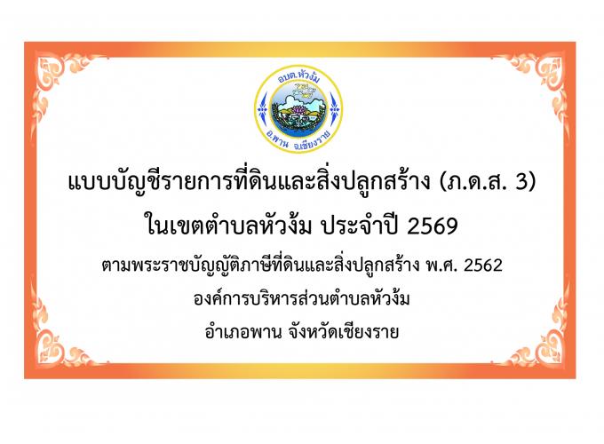 - ประกาศองค์การบริหารส่วนตำบลหัวง้ม เรื่อง บัญชีรายการที่ดินและสิ่งปลูกสร้าง (ภ.ด.ส.3) ประจำปี 2569 (ดู:210)