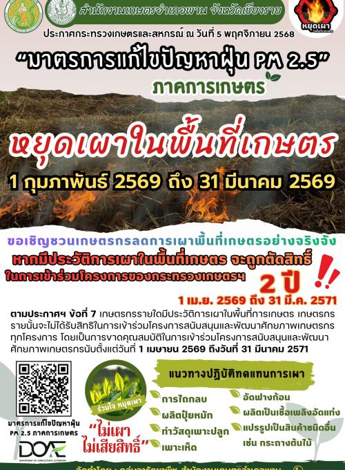 - ประชาสัมพันธ์ ห้ามมีการเผาในพื้นที่เกษตรกรรมในช่วงตั้งแต่วันที่ 1 กุมภาพันธ์ 2569 ถึงวันที่ 31 มีนาคม 2569 (ดู:5)