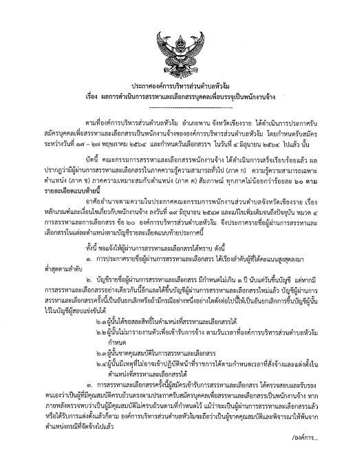 องค์การบริหารส่วนตำบลหัวง้ม ประกาศ เรื่อง ผลการดำเนินการสรรหาและเลือกสรรบุคคลเพื่อบรรจุเป็นพนักงานจ้าง
