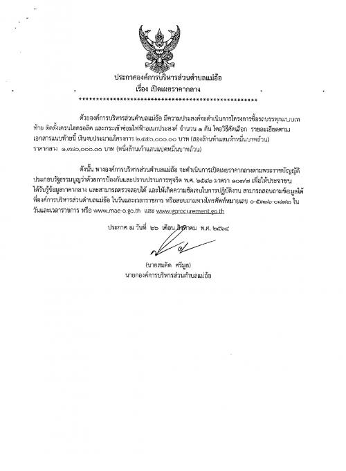 ประกาศองค์การบริหารส่วนตำบลแม่อ้อ เรื่อง เปิดเผยราคากลาง