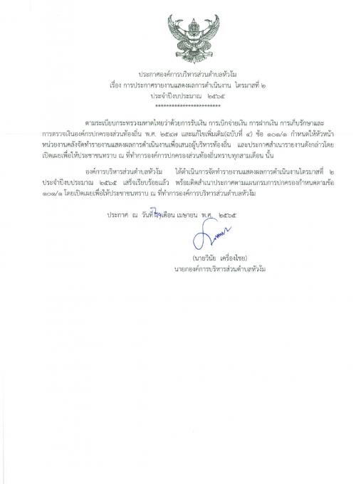 ประกาศองค์การบริหารส่วนตำบลหัวง้ม การประกาศรายงานแสดงผลการดำเนินงาน ไตรมาสที่ 2 ปี 2565