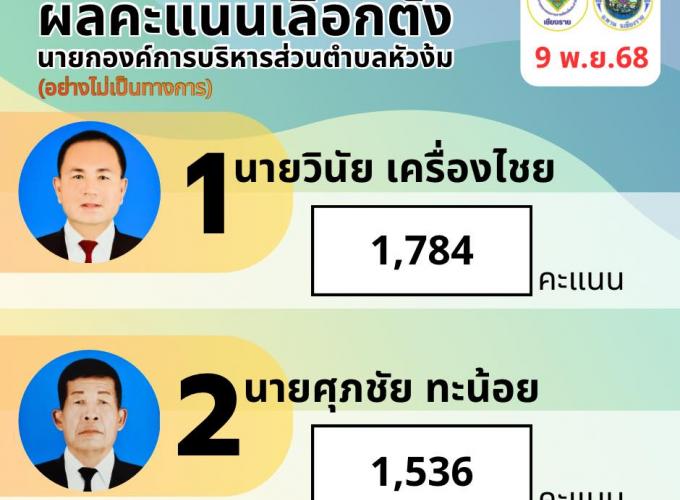 ประกาศองค์การบริหารส่วนตำบลหัวง้ม เรื่อง ผลคะแนนการเลือกตั้งนายกองค์การบริหารส่วนตำบลหัวง้ม (อย่างไม่เป็นทางการ) ในวันอาทิตย์ที่ 9 พฤศจิกายน 2568 . ✨"เลือกตั้งท้องถิ่น ร่วมกันใช้สิทธิ อย่างสุจริตโปร่งใส"✨