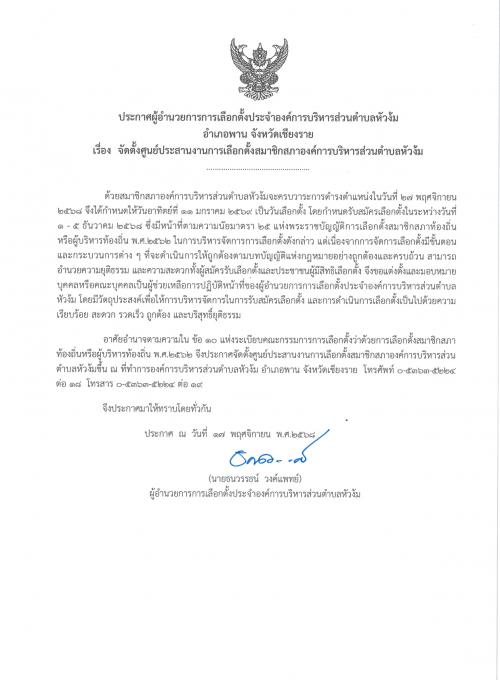 ประกาศผู้อำนวยการการเลือกตั้งประจำองค์การบริหารส่วนตำบลหัวง้ม เรื่อง จัดตั้งศูนย์ประสานงานการเลือกตั้งสมาชิกสภาองค์การบริหารส่วนตำบลหัวง้ม