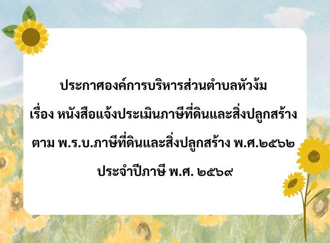 ประกาศองค์การบริหารส่วนตำบลหัวง้ม เรื่อง หนังสือแจ้งประเมินภาษีที่ดินและสิ่งปลูกสร้าง ตาม พ.ร.บ.ภาษีที่ดินและสิ่งปลูกสร้าง พ.ศ.๒๕๖๒ (จดหมายตีกลับ) ประจำปีภาษี พ.ศ. ๒๕๖๙